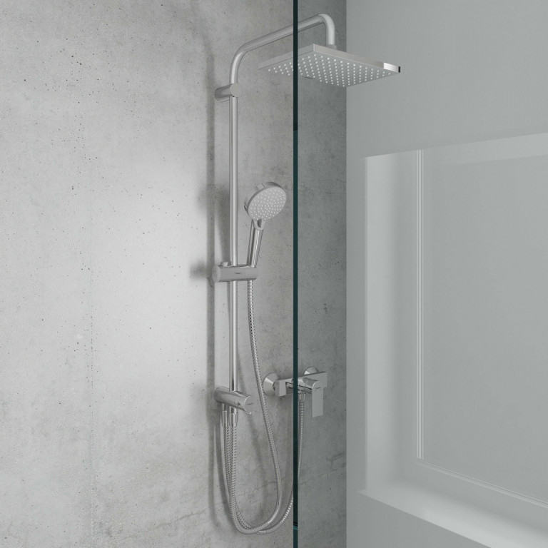 The hansgrohe Vernis Shape 230 Reno shower system is the intelligent solution for simple bathroom refurbishments. It is connected to an existing tap or water connection on the wall (e.g. hansgrohe FixFit) via a second shower hose. Yet another advantage: The overhead or hand shower can be conveniently selected with just a twist. The water quantity and temperature are controlled separately using the existing tap. So if a bath tub is converted to a shower, for example, the bath mixer can continue to be used with a connection for a hand shower. Or the bath tub can be upgraded with a high-quality hansgrohe shower solution.
