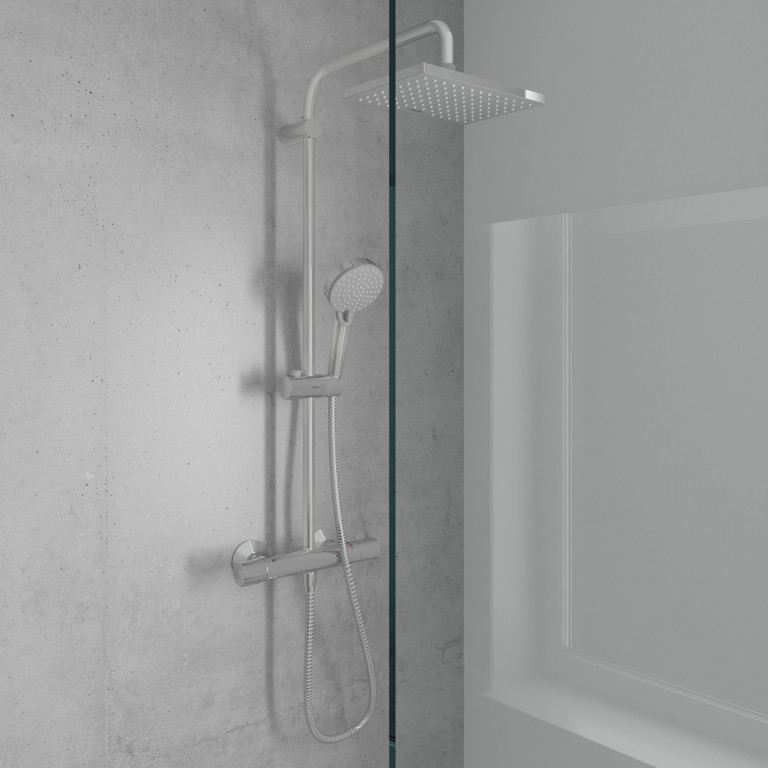 - Added convenience: The thermostatic mixer keeps the water at the set temperature and offers reliable protection against excessively hot or cold water