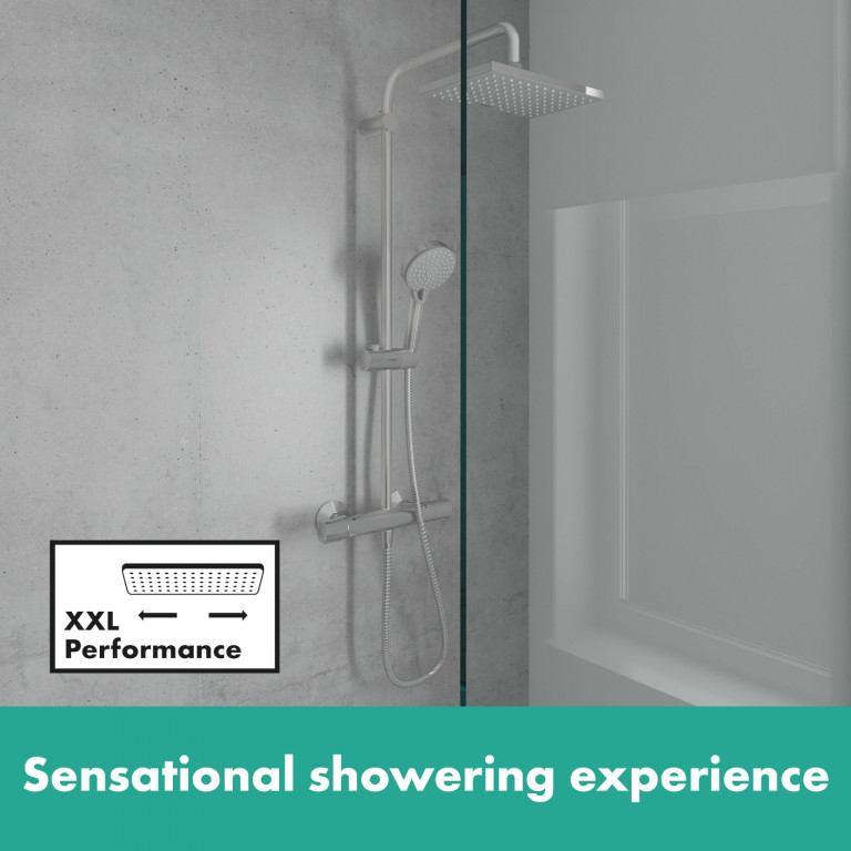 The 1.60 m long shower hose allows plenty of room to move. Comfortable, safe and indulgent showering: The high-quality hansgrohe thermostatic shower mixer is reliable at maintaining the set temperature. A safety lock protects against excessively hot water (SafetyStop). Users need to press a button if they want a hotter temperature.- Bold design on a budget: The geometric Vernis Shape shower head brings comfort and an enjoyable water experience to the bathroom