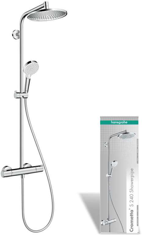 The Crometta S shower system 240 (1 jet) with Thermostat and Hand Shower Chrome features a large 240mm wide shower head and shower handset with a height-adjustable shower holder. The thermostat features SafetyStop to prevent unexpected increases in temperature. The shower surface is fully chrome-plated and offers QuickClean technology for easy limescale removal.- The 240 mm wide overhead shower and the 100 mm wide hand shower envelop the body with indulgent sprays (XXL Performance)