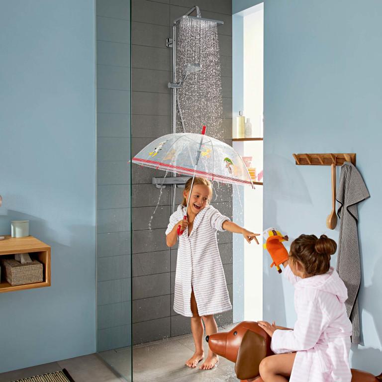 The thermostatic mixer’s surface remains cool when showering (CoolContact) to reliably protect the hands of all from scalding. The water temperature also remains constant during pressure fluctuations. The elegant exposed installation thermostatic mixer kicks into action automatically and instantly. To keep young explorers safe from excessively hot water, a safety lock is put in place when the water reaches 40° C. If you like it warmer, it can be turned off at the touch of a button.