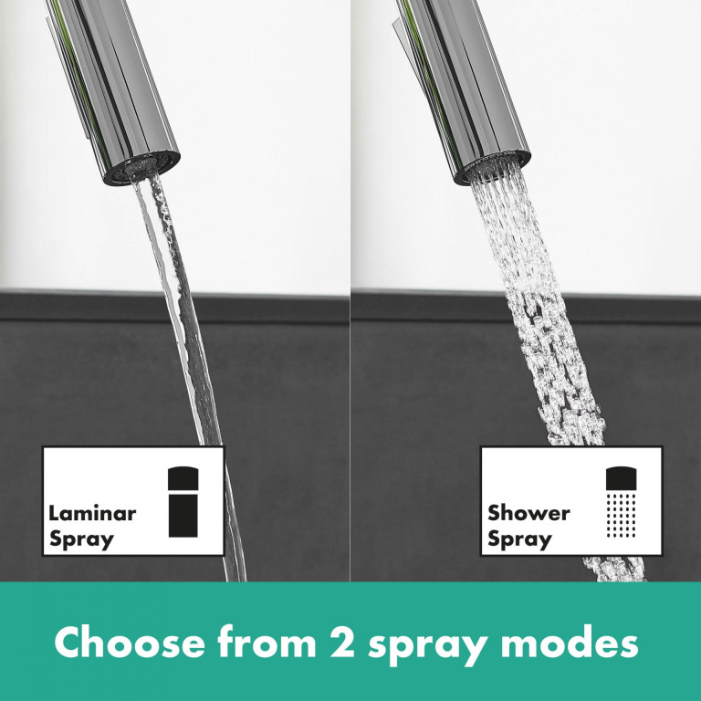 The Focus M41 Single lever kitchen mixer 240, pull-out spray, 2jet from hansgrohe makes daily kitchen chores so much easier with many helpful functions. The ergonomic design with a nice spout height of 230 mm enables people to fill even the largest of containers with ease (ComfortZone). The spout can be pulled out to approx. 50 cm to extend the working radius. It has two swivel settings (110° or 150°) for extra options