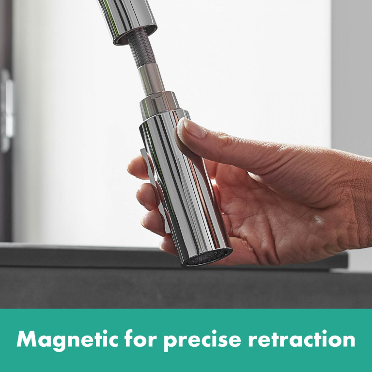 - Tucked away within reach: If the hand spray is no longer needed, it glides back quietly and centrally into a magnetic slot (MagFit)