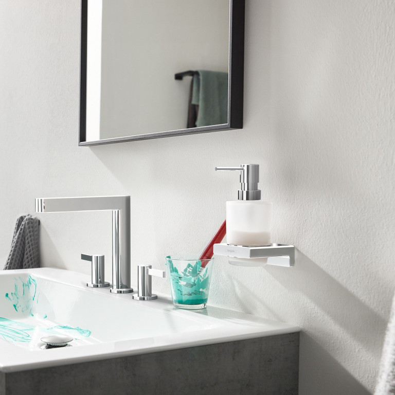 The AddStoris liquid soap dispenser from hansgrohe adds visual and functional flair to the bathroom. The glass container can hold approx. 200 ml liquid soap and it releases clean portions (2 ml) when pressure is applied to the pump. The modern and minimalist design wows users with its distinct, bold style. It goes really well with geometric bathroom taps, such as the hansgrohe Metropol range.