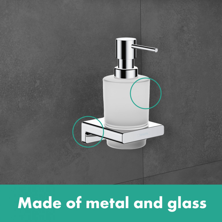And the hansgrohe quality keeps the promises made by the premium design: THet AddStoris liquid soap dispenser is made of metal and glass, so it is made to last. This product is both a sustainable use of resources and it reduces the amount of plastic in the environment. The metal surface finish is lavishly chrome-plated – a material that is easy to clean and keeps its shine.