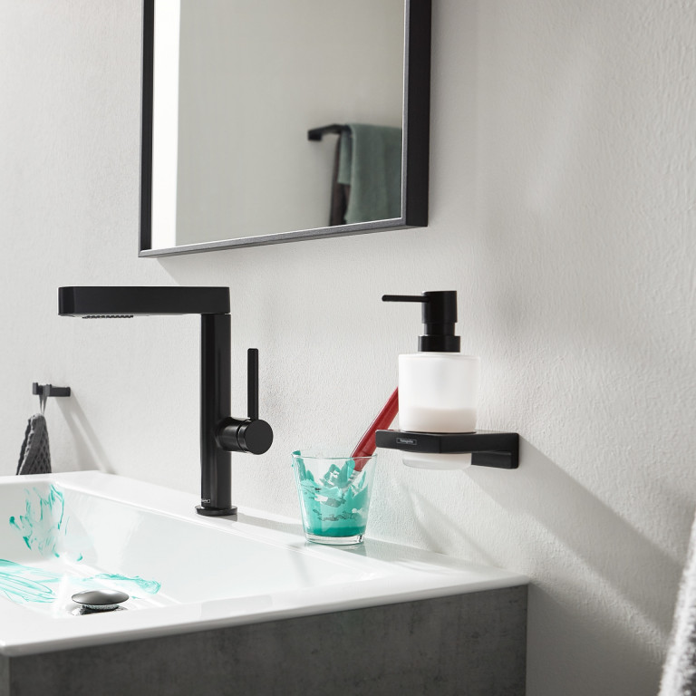 And the hansgrohe quality keeps the promises made by the premium design: THet AddStoris liquid soap dispenser is made of metal and glass, so it is made to last. This product is both a sustainable use of resources and it reduces the amount of plastic in bathrooms. The metal surface finish in a matt black colour is easy to clean and is one of the colour schemes in the range of hansgrohe special surface finishes for taps (FinishPlus). So everything can match perfectly.