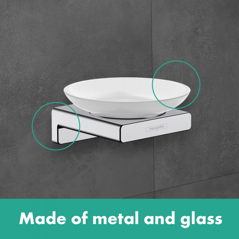 And the hansgrohe quality keeps the promises made by the premium design: THet AddStoris soap dish is made of glass and can be easily removed for cleaning. The chrome-plated metal bracket is durable and will retain its lustre for a long time to come. This product is both a sustainable use of resources and it reduces the amount of plastic in the environment.