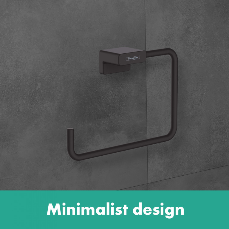 And the hansgrohe quality keeps the promises made by the premium design: THet AddStoris towel ring is made of metal, so it is made to last. This product is both a sustainable use of resources and it reduces the amount of plastic in bathrooms. The surface finish in a matt black colour is easy to clean and is one of the colour schemes in the range of hansgrohe special surface finishes for taps (FinishPlus). So everything can match perfectly.