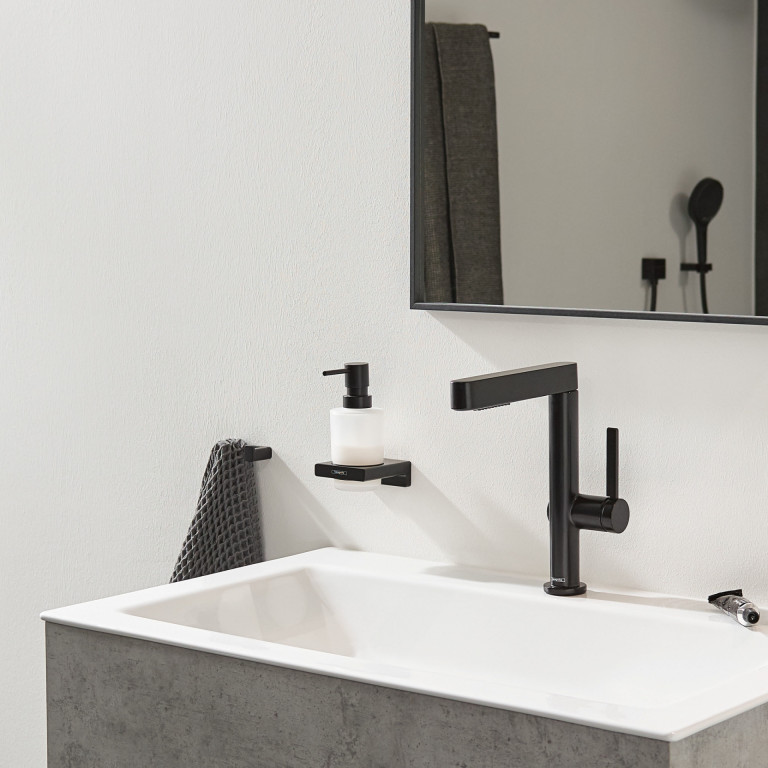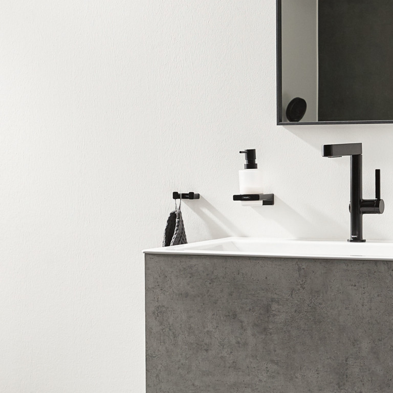 And the hansgrohe quality keeps the promises made by the premium design: THet AddStoris bath towel holder is made of metal, so it is made to last. This product is both a sustainable use of resources and it reduces the amount of plastic in bathrooms. The surface finish in a matt black colour is easy to clean and is one of the colour schemes in the range of hansgrohe special surface finishes for taps (FinishPlus). So everything can match perfectly.