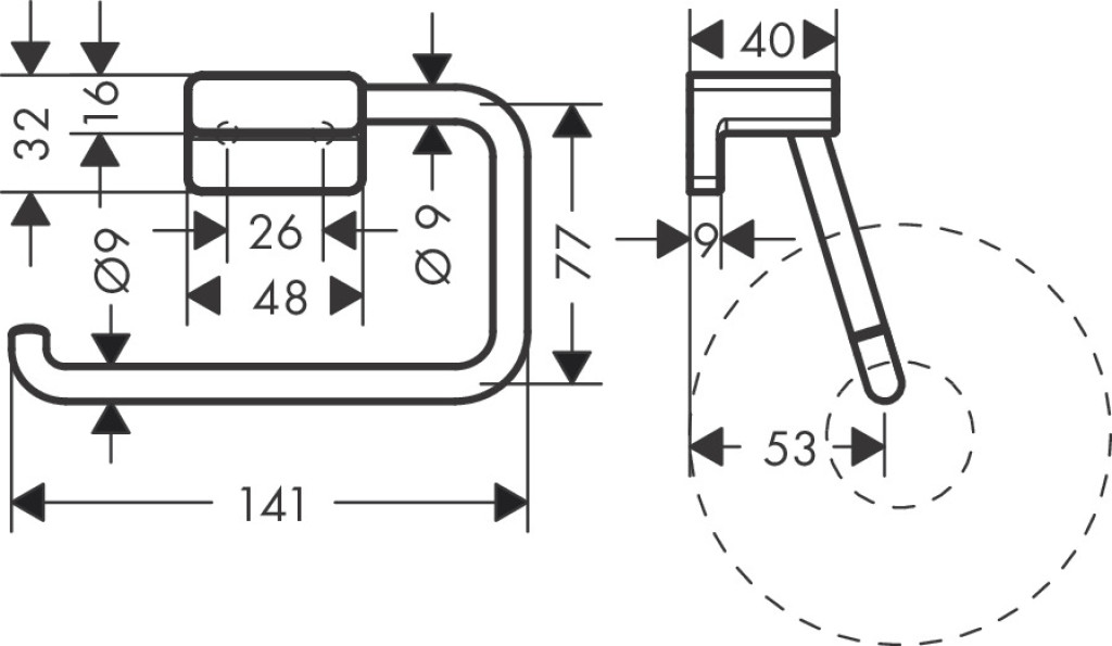 The roll holder is safely affixed to the wall using two screws. The hole spacing is 26 mm.- Perfect partner: The distinct design exudes high value and goes well with modern taps such as the hansgrohe Metropol range