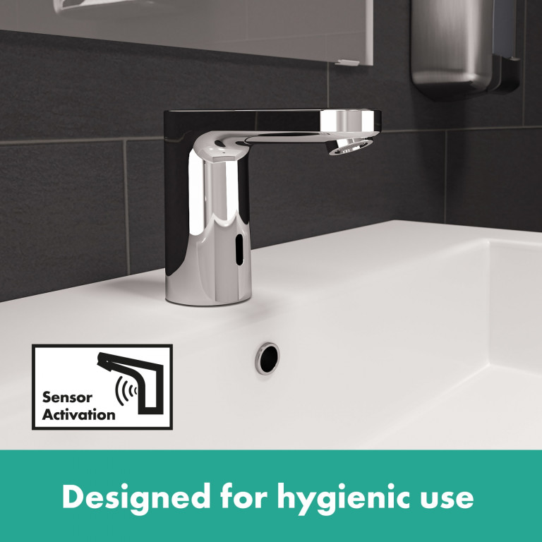 The Vernis Blend electronic basin mixer with preset temperature and mains connection (230 V) is your professional solution for public and semi-public washrooms. Wherever safe hygiene, permanently reliable function, and low operating costs are required, the sensor tap of the hansgrohe Vernis Blend line is the first choice. The water temperature can be flexibly preset, so there is no need for a separate operating lever. This allows for 100% touch-free hand washing. Hygiene is improved, especially in those places where there are many different users, such as public wash rooms in restaurants, as well as in schools or hospitals and nursing homes.