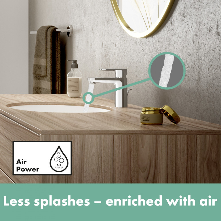 The water quantity and temperature can be set using the user-friendly and ergonomically shaped handle. It controls the high-quality hansgrohe ceramic mixer system and does not loosen, even after frequent use. Another advantage: This tap saves money and protects the environment, as the flow rate is automatically limited to 5 l/min, even when the water pressure is high (EcoSmart). The water is enriched with air for a full water jet (AirPower). This creates plumper and lighter droplets that feel velvety soft and cause less splash.- Timeless design for tight budgets: The harmonious design of the Vernis Blend taps brings subtle elegance and plenty of comfort to the bathroom