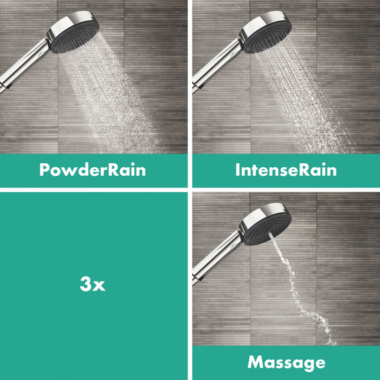 Switch between the different jet types at the touch of a button (Select): hansgrohe PowderRain gently envelops the body in a cocoon of the finest of water droplets. IntenseRain invigorates and is perfect for rinsing out shampoo. The third type of jet is a strong massage spray. The shower becomes a place for daily moments of relaxation.