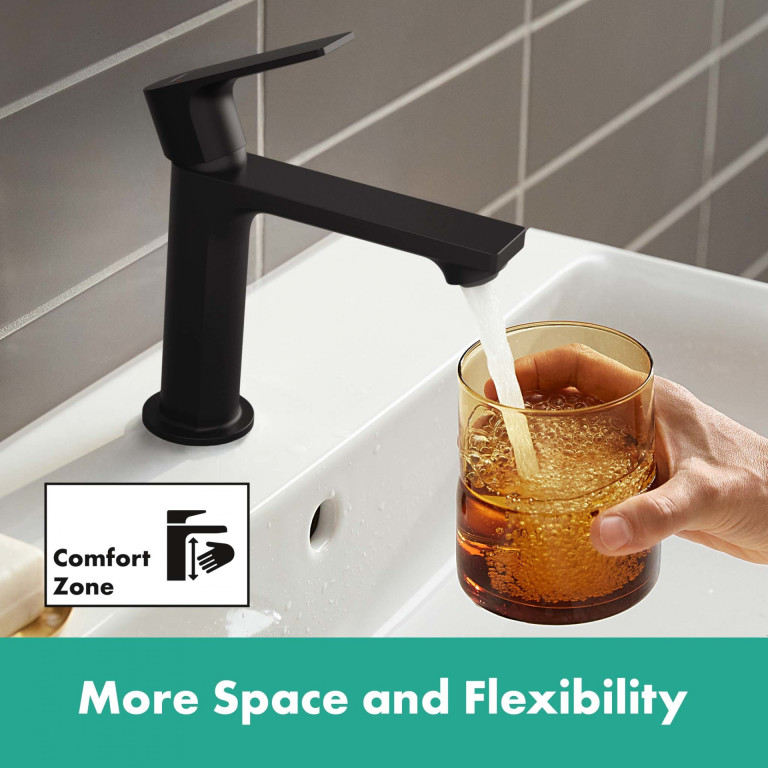 With its timeless, sleek design, the Rebris E 110 CoolStart EcoSmart+ basin tap with pop-up waste visibly enhances your bathroom. The sleek shapes and precise finishes create a striking look. Rebris E has modern designer taps at a fair price. Make your own dream bathroom a reality.