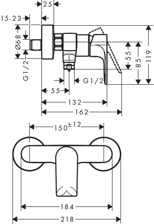 The mixer for exposed installation is screwed onto an existing standard water outlet. The S-connections are included in the scope of supply. Benefit: the wall does not have to be opened up. Any commercially available hose will fit the shower hose connection. At up to 14.9 l/min (3 bar), the maximum flow rate supplies large hand showers also, thereby offering the best possible conditions for showering indulgence from hansgrohe.