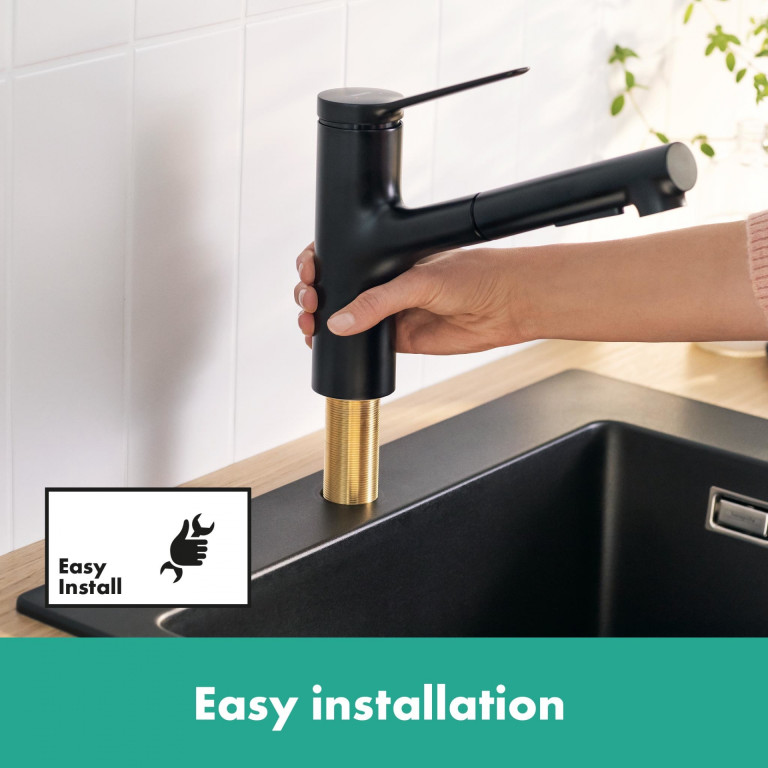 Flexible connection hoses with hansgrohe Quick-Connect make assembly easier. The hose weight even works without screws. It is clipped around the pull-out hose.- Ergonomic design: The ergonomic shape makes kitchen chores easier and is a good fit for modern kitchens