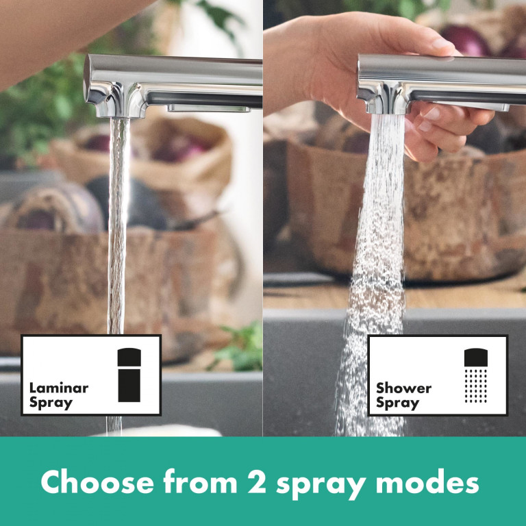 Flexible connection hoses with hansgrohe Quick-Connect make assembly easier. The hose weight even works without screws. It is clipped around the pull-out hose.- Ergonomic design: The ergonomic shape makes kitchen chores easier and is a good fit for modern kitchens