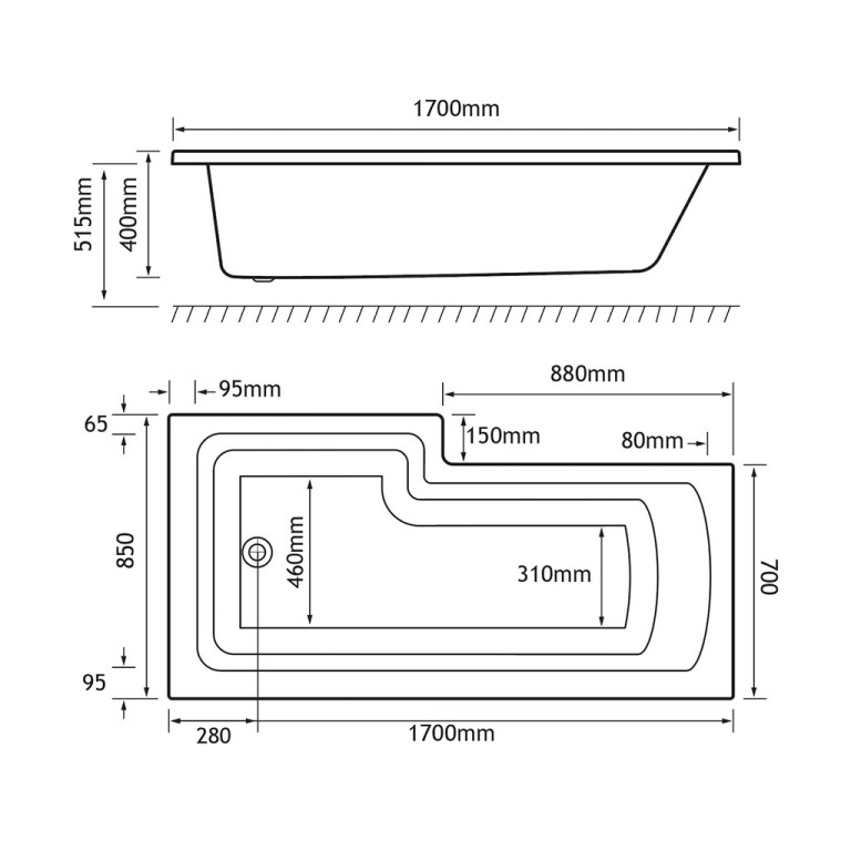 - Length: 1700mm, Width: 700mm, Internal depth: 400mm, Height: 515mm