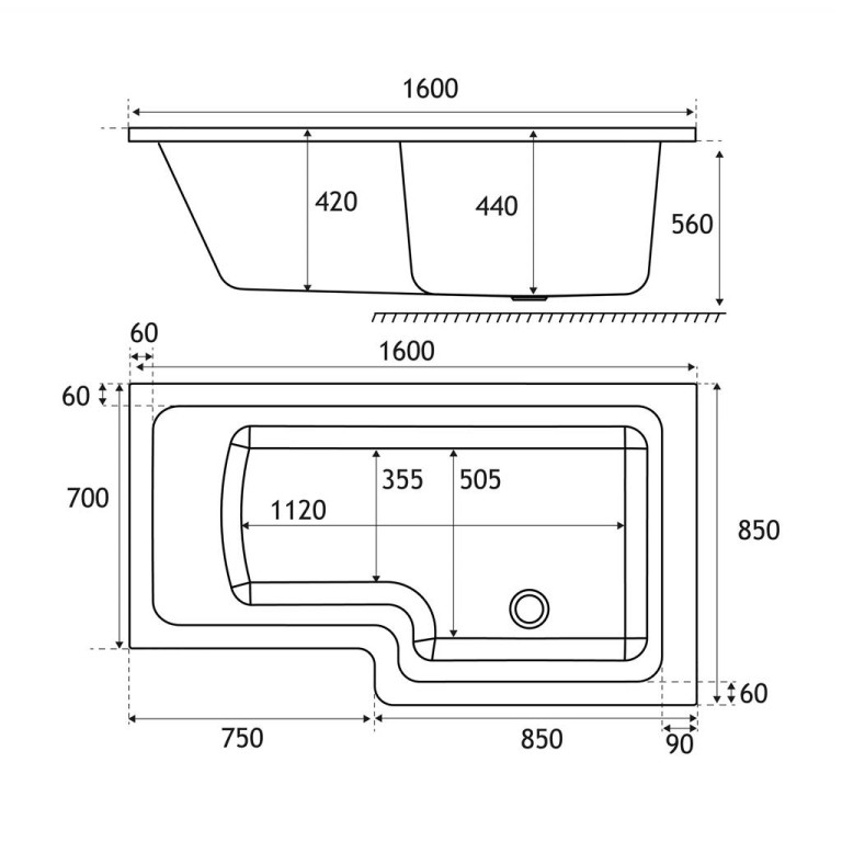 - Length: 1600mm, Width: 850mm, Internal depth: 440mm, Height: 560mm