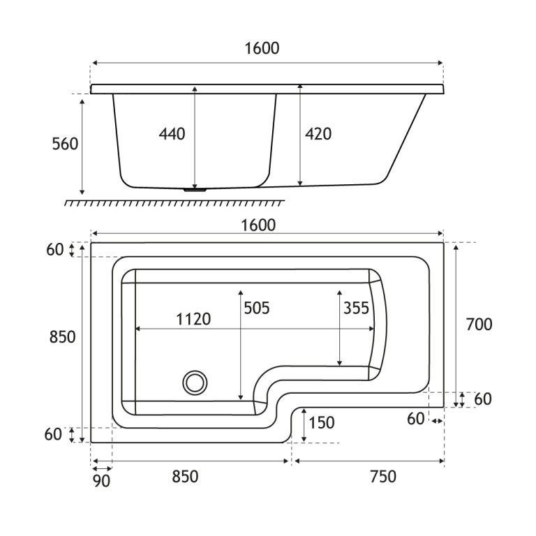 - Length: 1600mm, Width: 850mm, Internal depth: 440mm, Height: 560mm