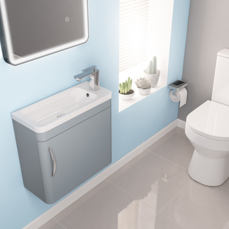 The Cavone bathroom furniture features a luxurious curved basin that flows perfectly with the curved lines of the doors of the vanity unit. Features soft close doors, interchangeable chrome or black handles, built in overflow. Unit only, basin sold separately.