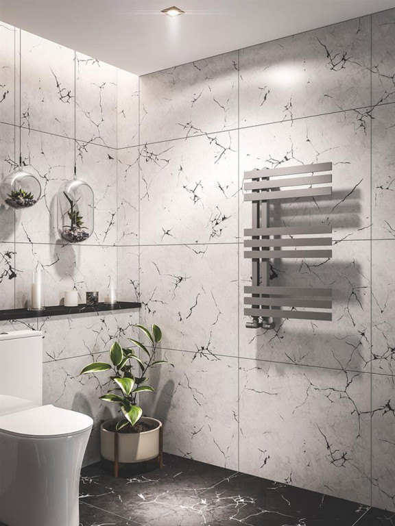 A modern, versatile designer towel rail. Available in 6 colours with reversible installation possibility.