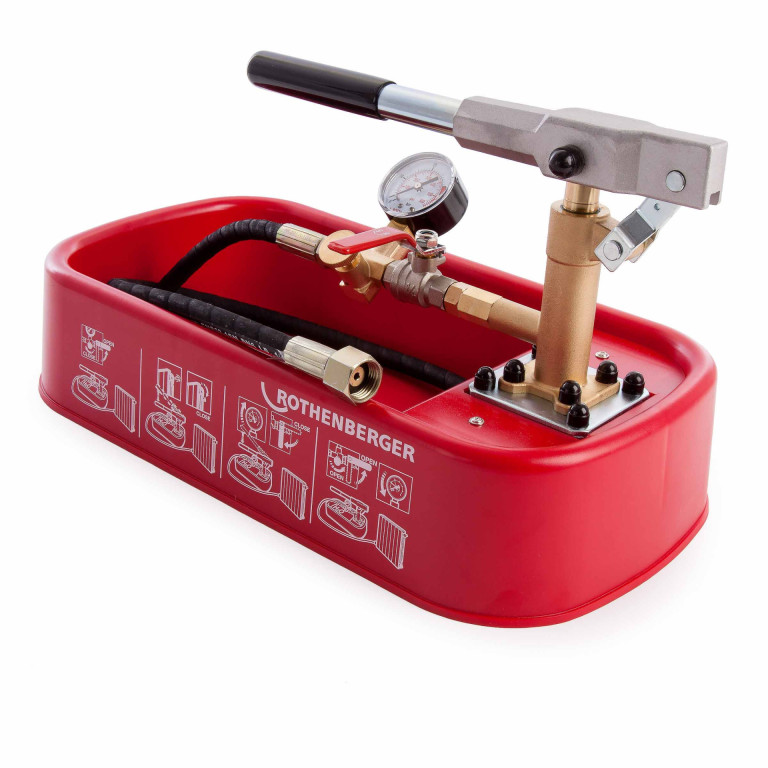 Compact pump ideally suited to domestic pipework testing including underfloor heating systems. Maximum Pressure 30 bar (420 psi).Tank Capacity: 4.5 litres. Connection: R1/2" BSPT - Quick pressure and leak testing of small piping systems and vessels in sanitary and heating installations