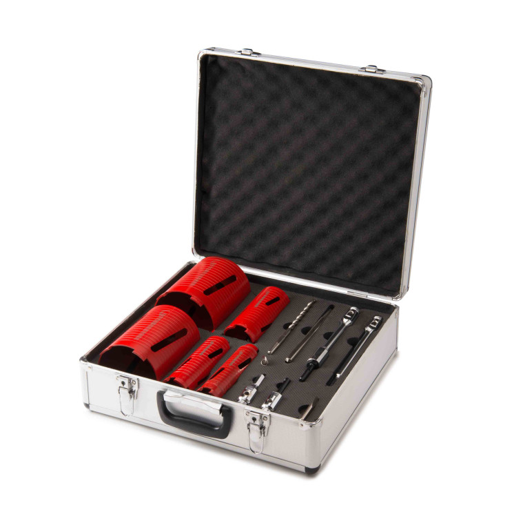 The new 12 piece Dry Diamond Core Drill set incorporates of the most commonly used plumbing and general building size, ideal for hand basin waste overflow shower and bath waste pipe, tumble dryer vents and boiler flues.