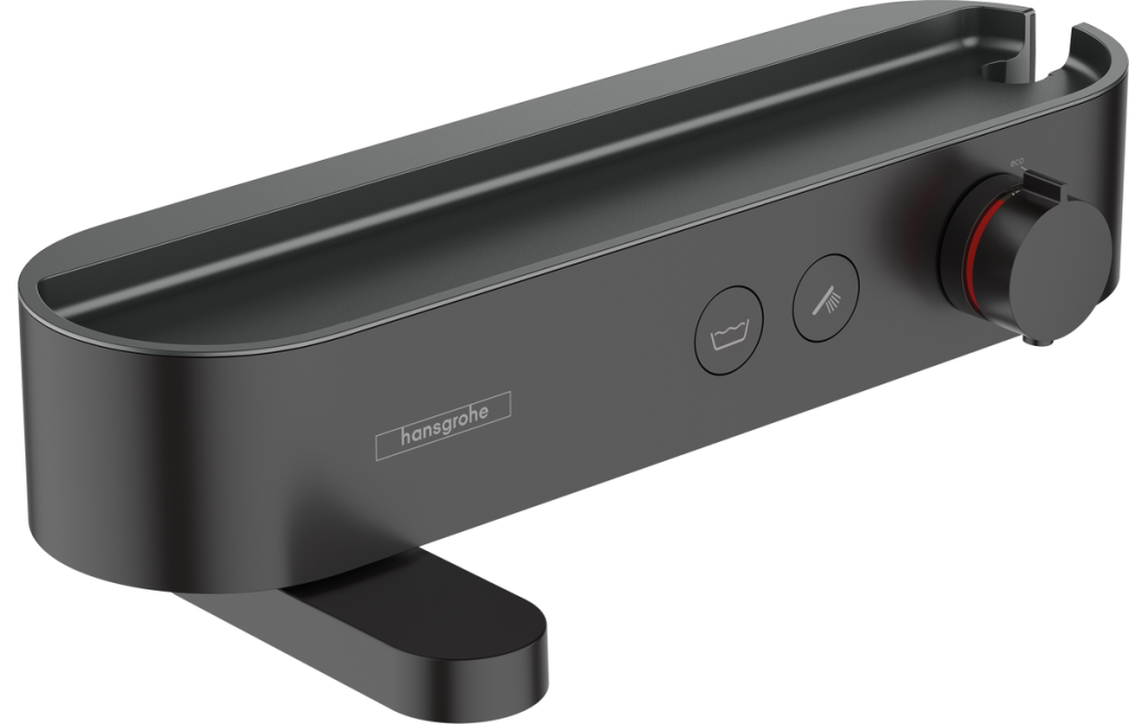 rotatable bath spout, designed to run 2 outlets, simultaneous utilisation by 2 outlets, temperature and volume control, Select push button on / off control for 2 outlets, CoolContact thermostat: Prevents the housing from heating up, making showering even safer, Maximum flow rate (at 3 bar): 18.7 l/min , Flow rate for bath spout (at 3 bar): 18.7 l/min , Flow rate of hand shower (at 3 bar): 15.9 l/min , Min. operating pressure: 1 bar , Max. operating pressure: 10 bar , safety stop at 40°C, Maximum temperature can be adjusted on installation, with isolated water conduction, Non-return valve, protected against backflow, according to DIN EN 1717, with silencer, Material handles: plastic , shelf made of plastic, Shelf colour: graphite , wall-mounted, Centre distance: 150 mm ± 12 mm , dirt filter included, thermostat is delivered with buttons hand shower and bath tub, if running with a pump, please specify a universal (negative head) pump