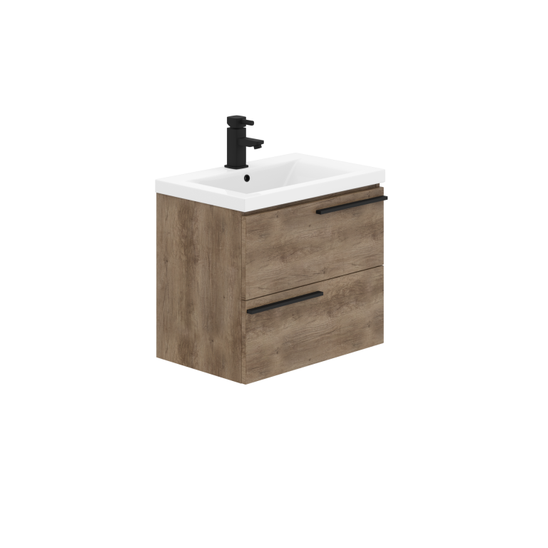 Ivy 60cm 2 Drawer Wall Hung Basin Unit White Halifax Oak, Black handle