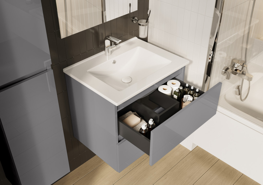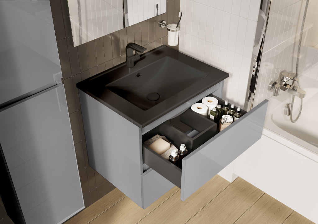 Sussex features a handleless design on the drawers and doors with the option of either White Gloss or Black Matt basin (sold separately)