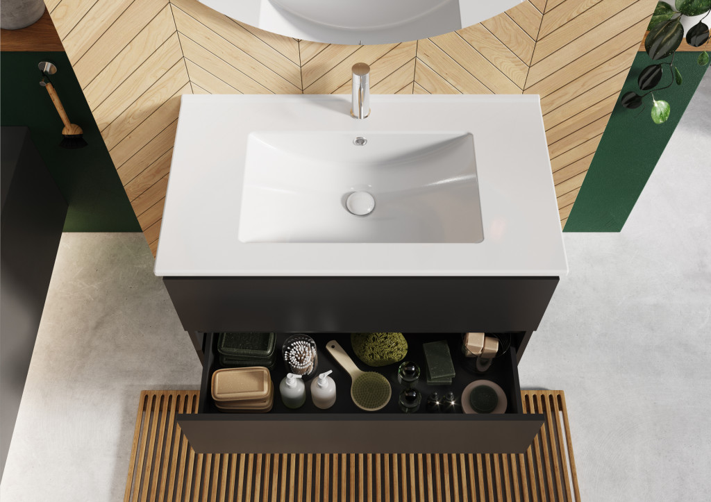 Sussex features a handleless design on the drawers and doors with the option of either White Gloss or Black Matt basin (sold separately)