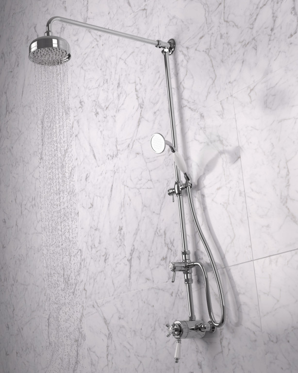 - Traditional shower kit with external diverter, shower rose, rigid riser and handset