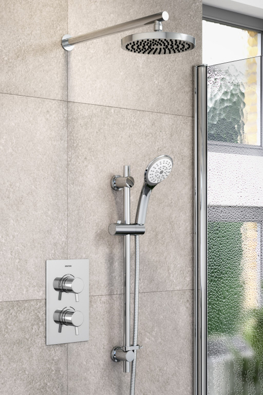 - This versatile shower pack contains a Prism shower valve with integral two outlet diverter. It has a 200mm round fixed head with shower arm; and an adjustable riser shower kit with a single function large handset.