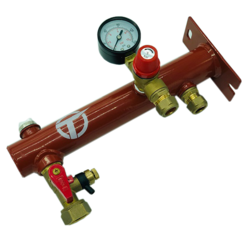 - Kit includes, manual air vent, expansion vessel service valve, 3/4" thread for direct connection to an expansion vessel, 3 bar pressure relief valve with gauge, 15mm system inlet & wall fixing backplate
