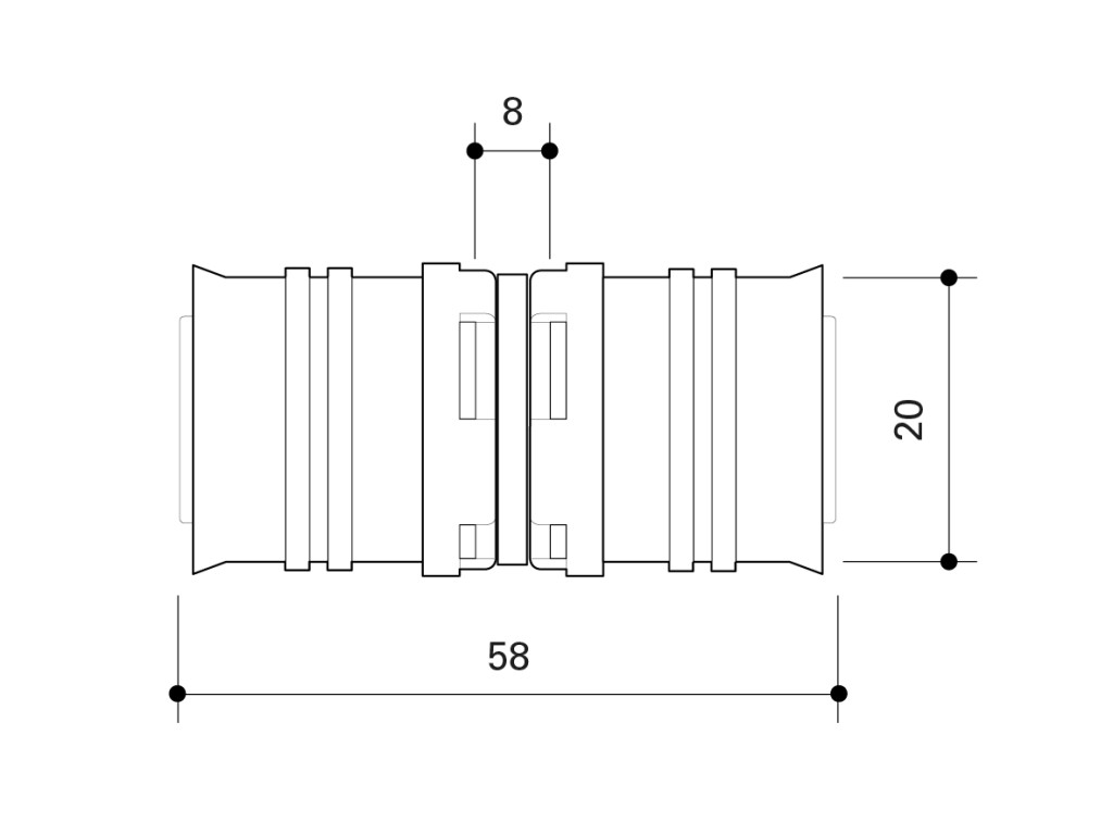 Coupling made of PPSU for drinking water and heating system installations featuring white fixation rings with integrated inspection holes, fixed stainless steel pressing sleeves and leak function. Pressable with pressing contours F and TH.