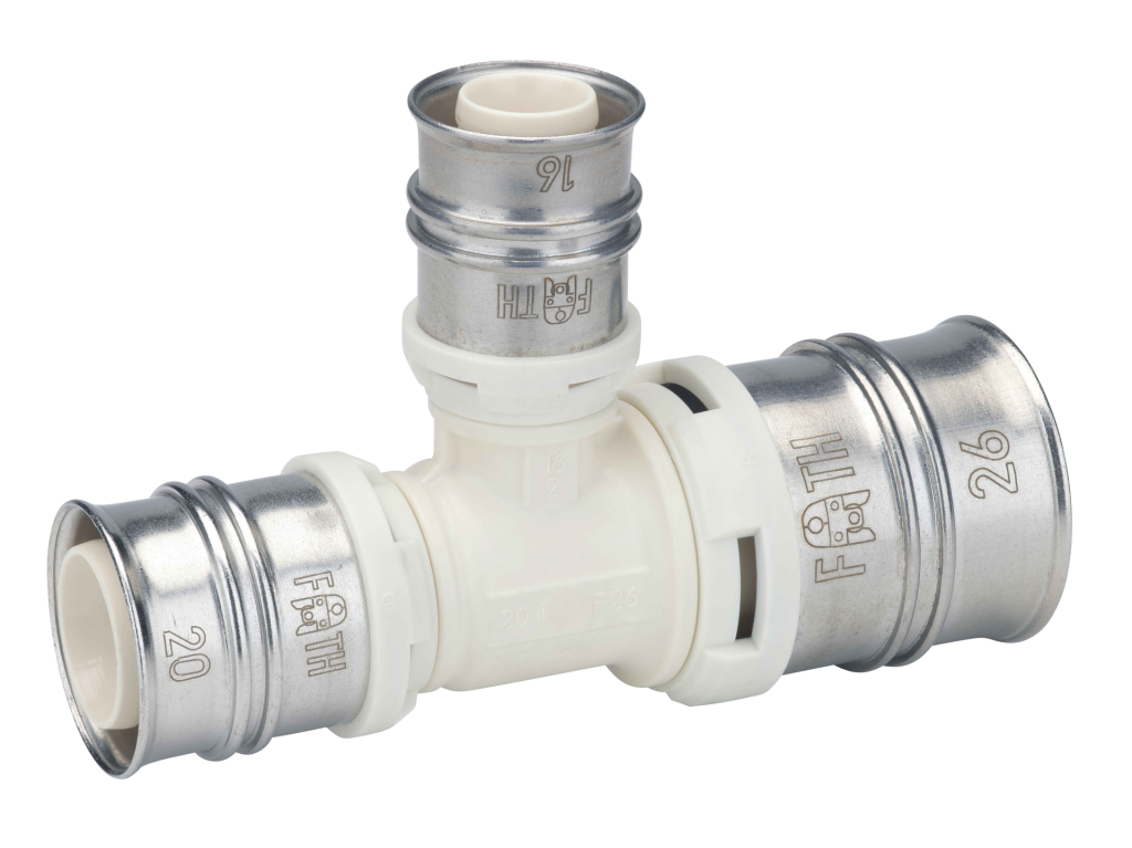 Reduced tee made of PPSU for drinking water and heating system installations featuring white fixation rings with integrated inspection holes, fixed stainless steel pressing sleeves and leak function. Pressable with pressing contours F and TH.