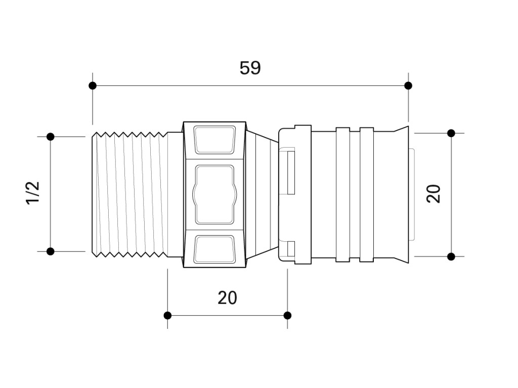 Male thread adapter according to DIN EN 10226-1 made of PPSU for drinking water and heating system installations featuring a white fixation ring with integrated inspection holes, fixed stainless steel pressing sleeve and leak function. Pressable with pressing contours F and TH.