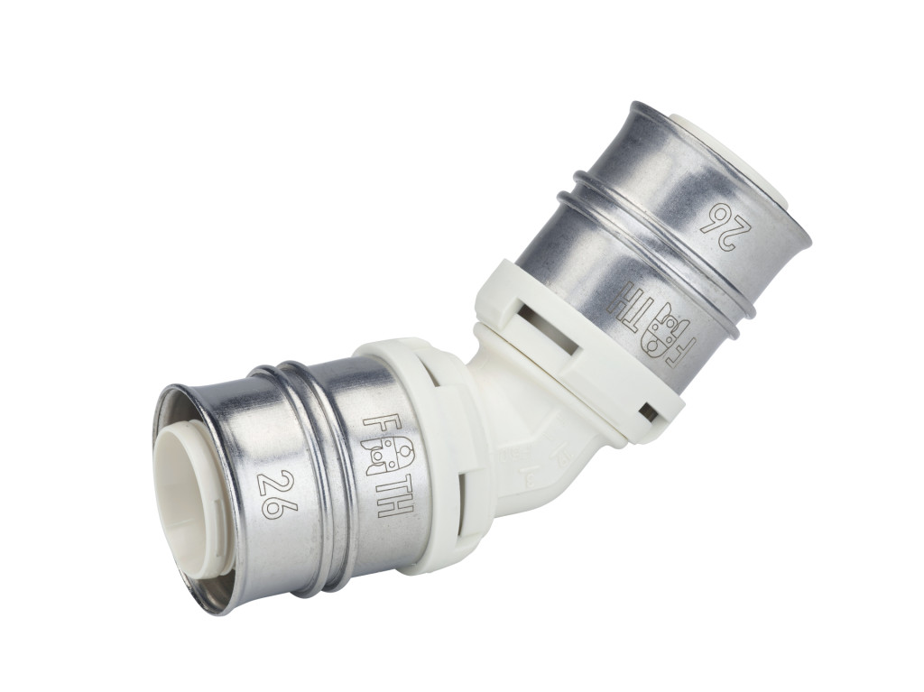 45 degrees elbow made of PPSU for drinking water and heating system installations featuring white fixation rings with integrated inspection holes, fixed stainless steel pressing sleeves and leak function. Pressable with pressing contours F and TH.