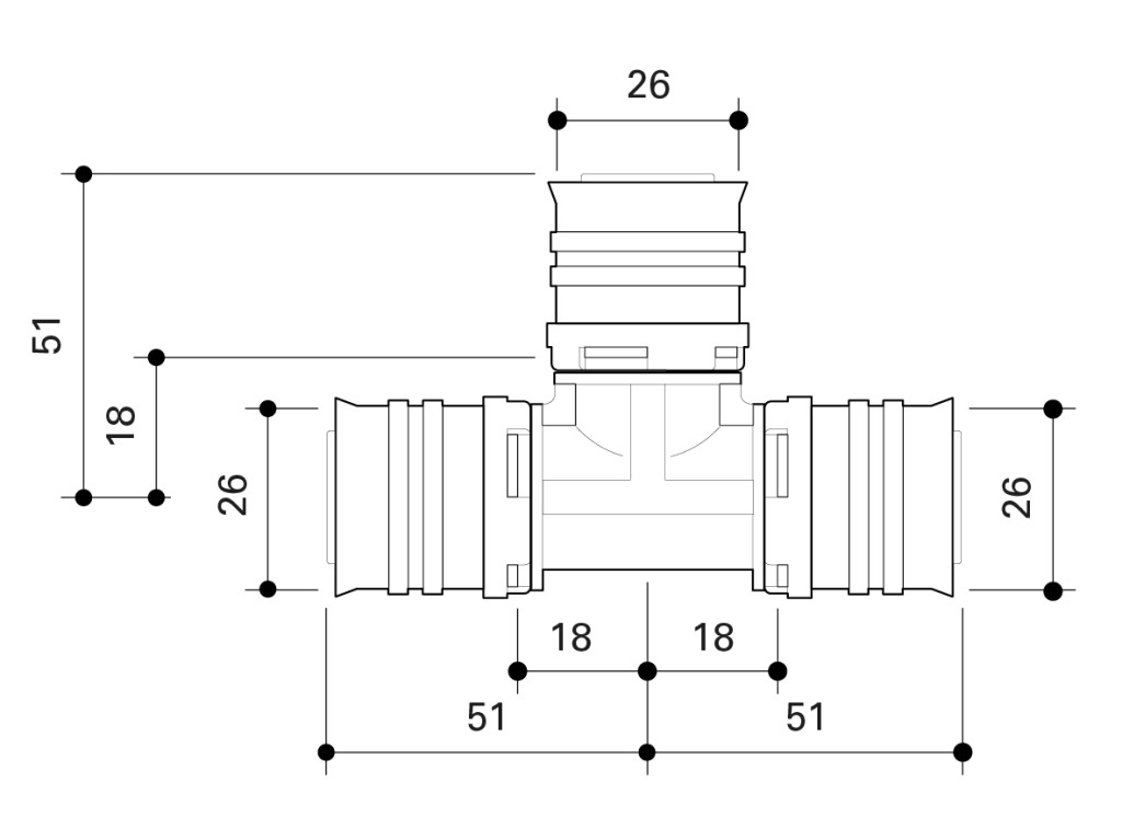 Tee made of PPSU for drinking water and heating system installations featuring white fixation rings with integrated inspection holes, fixed stainless steel pressing sleeves and leak function. Pressable with pressing contours F and TH.