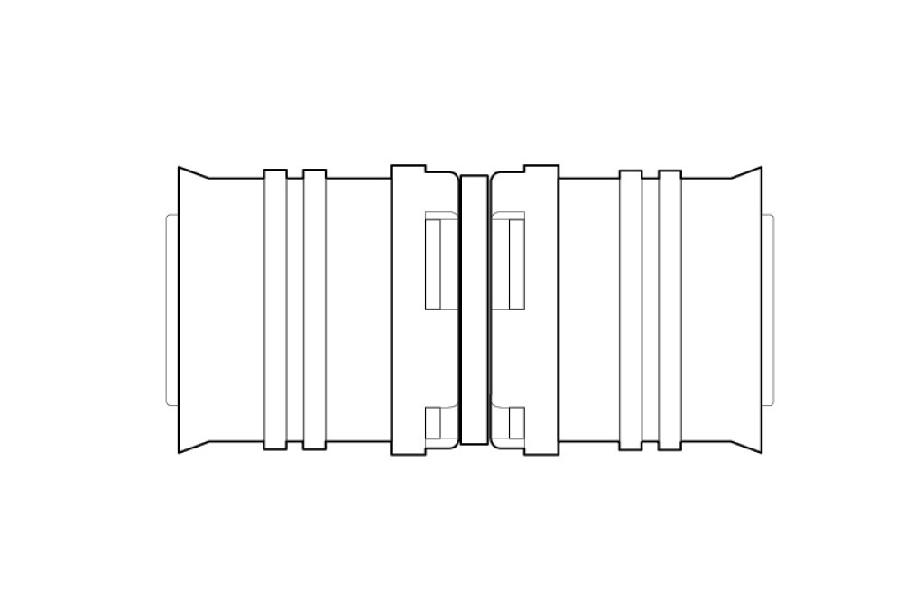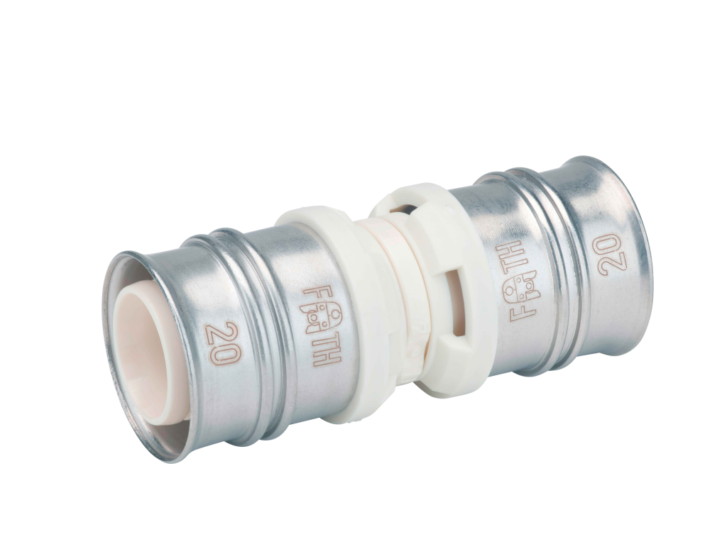 Coupling made of PPSU for drinking water and heating system installations featuring white fixation rings with integrated inspection holes, fixed stainless steel pressing sleeves and leak function. Pressable with pressing contours F and TH.