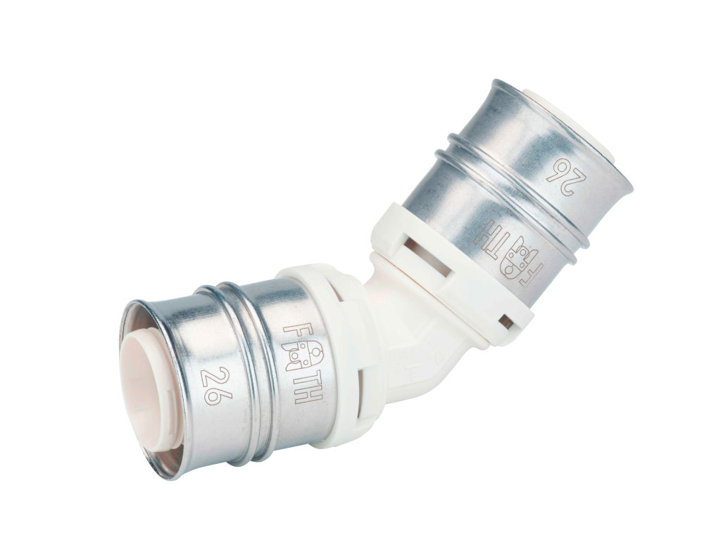 45 degrees elbow made of PPSU for drinking water and heating system installations featuring white fixation rings with integrated inspection holes, fixed stainless steel pressing sleeves and leak function. Pressable with pressing contours F and TH.