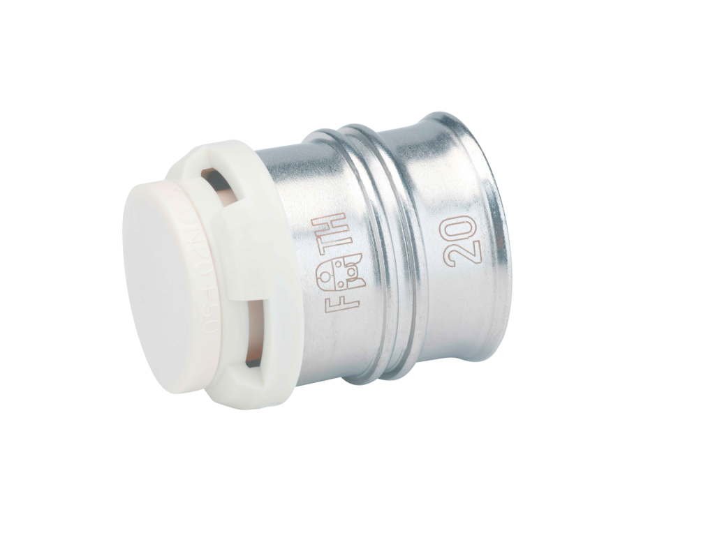 End cap made of PPSU to seal pipe ends in drinking water and heating systems featuring a white fixation ring with integrated inspection holes, fixed stainless steel pressing sleeve and leak function. Pressable with pressing contours F and TH.
