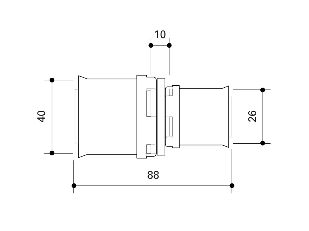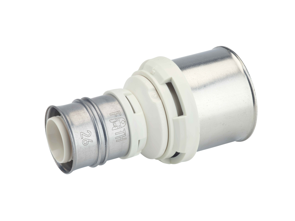 Reduced coupling made of PPSU or dezincification-resistant brass for drinking water and heating system installations featuring white fixation rings with integrated inspection holes, fixed stainless steel pressing sleeves and leak function. Can be pressed using the F-contour, the dimensions smaller than or equal to 32 mm also with the TH pressing contour.