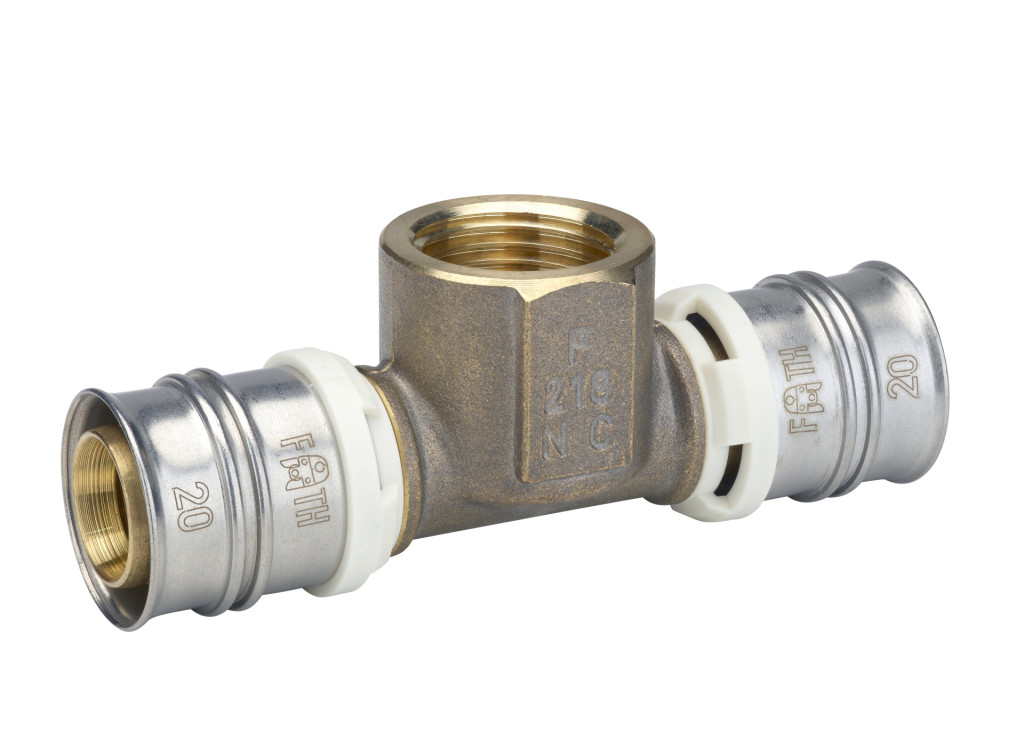 Female thread tee adapter according to DIN EN 10226-1 made of dezincification-resistant brass for drinking water and heating system installations featuring white fixation rings with integrated inspection holes, fixed stainless steel pressing sleeves and leak function. Pressable with pressing contours F and TH.