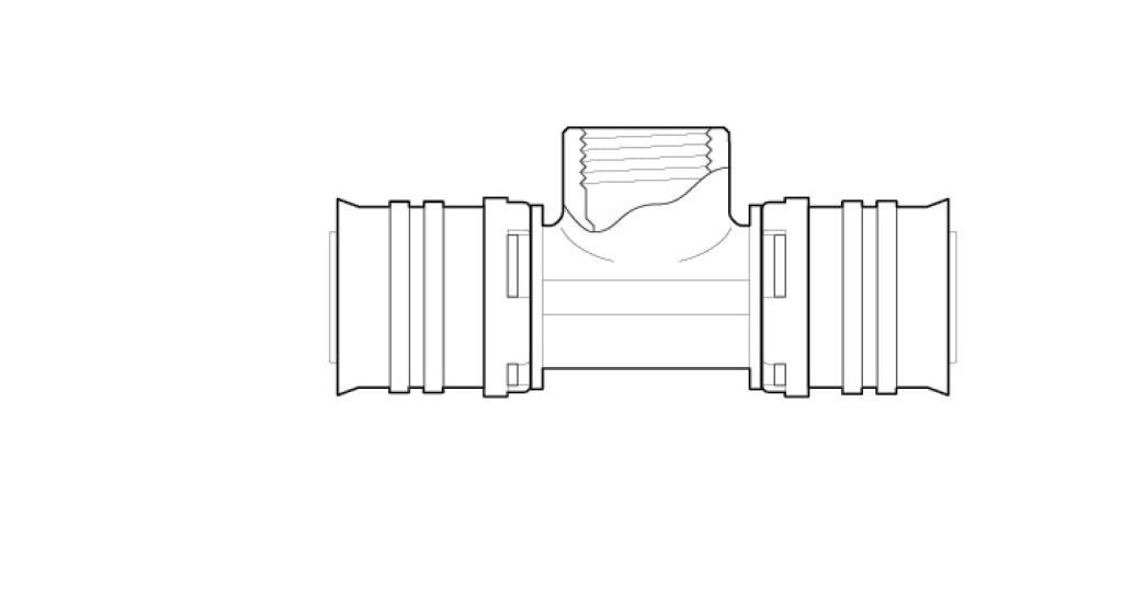 Female thread tee adapter according to DIN EN 10226-1 made of dezincification-resistant brass for drinking water and heating system installations featuring white fixation rings with integrated inspection holes, fixed stainless steel pressing sleeves and leak function. Pressable with pressing contours F and TH.