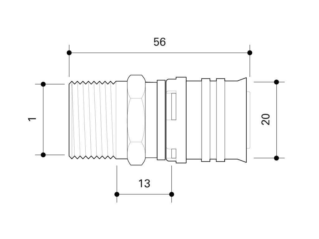 Male thread adapter according to DIN EN 10226-1 made of dezincification-resistant brass for drinking water and heating system installations featuring a white fixation ring with integrated inspection holes, fixed stainless steel pressing sleeve and leak function. Pressable with pressing contours F and TH.