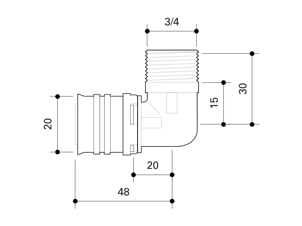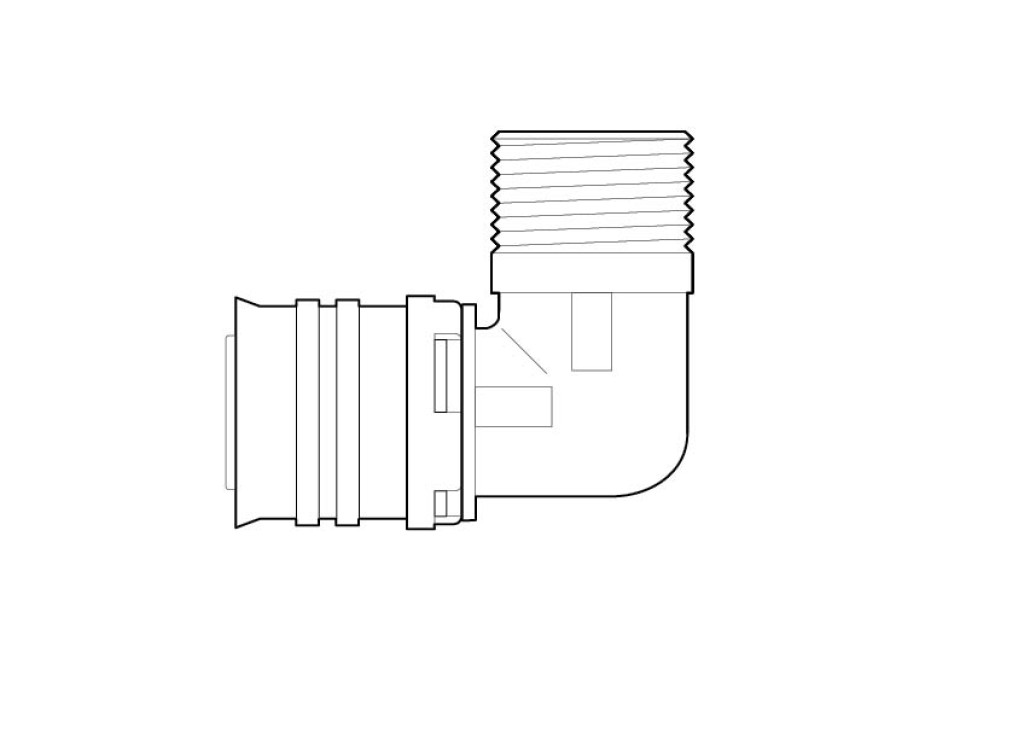 Male thread elbow adapter according to DIN EN 10226-1 made of dezincification-resistant brass for drinking water and heating system installations featuring a white fixation ring with integrated inspection holes, fixed stainless steel pressing sleeve and leak function. Pressable with pressing contours F and TH.