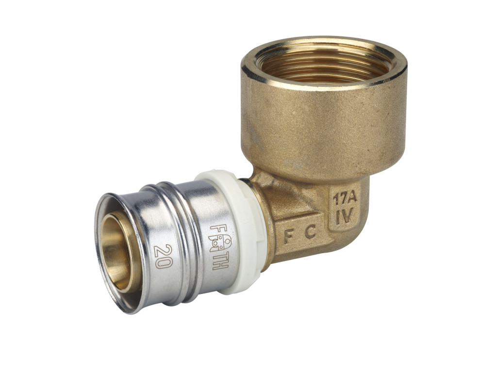 Female thread elbow adapter according to DIN EN 10226-1 made of dezincification-resistant brass for drinking water and heating system installations featuring a white fixation ring with integrated inspection holes, fixed stainless steel pressing sleeve and leak function. Pressable with pressing contours F and TH.