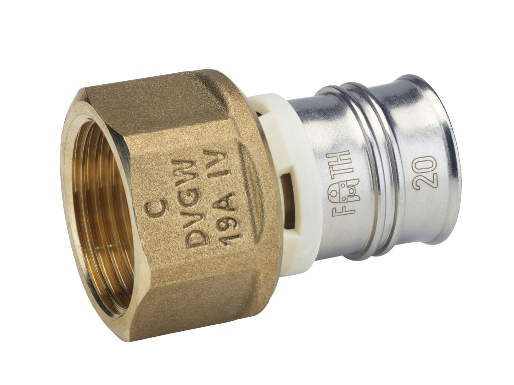Female thread adapter according to DIN EN 10226-1 made of dezincification-resistant brass for drinking water and heating system installations featuring a white fixation ring with integrated inspection holes, fixed stainless steel pressing sleeve and leak function. Pressable with pressing contours F and TH.